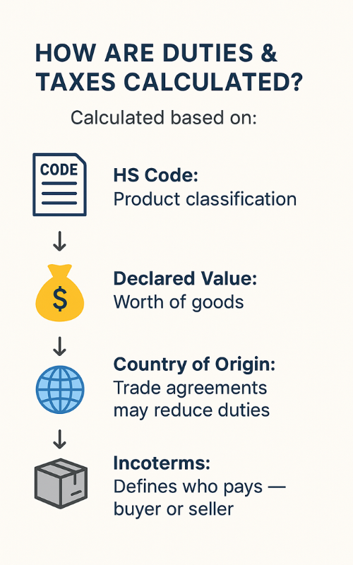 While the rates vary depending on country, duties and taxes are most often determined by: